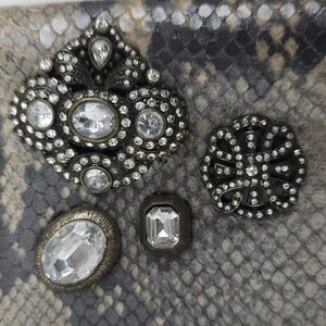 100% leather body; brass, zinc, glass & acrylic embellishments