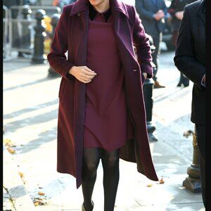 Meghan wore this burgundy collared coat from Club Monaco for an engagement in 2018. Worn once! In new condition.
