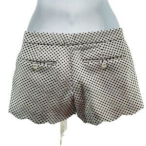 Club Monaco's chic white shorts feature an eye-catching black polka dot pattern, and a unique textured finish. Women's size 0, they offer a secure zip-up, clasp button closure, buttoned back pockets, and scalloped edges for a feminine touch.
