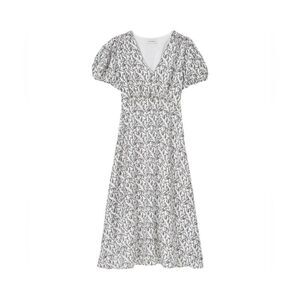 • V-neck; ruched shoulders and waist; short puff sleeves; front button placket