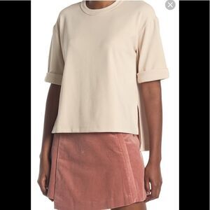 A boxy style top gets modern elements of design with side slits and a hi-lo hem. - Round neck - Short sleeves with cuff detailing - Side slits - Hi-lo hem - Approx 24" length (size S) - Imported