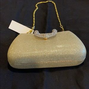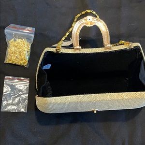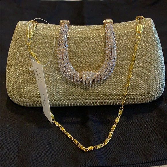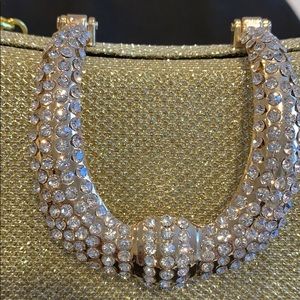 Beautiful sparkly golden clutch. Hard case. Inside is velvet. Golden metalic buckle covered with rimestones (all intact. Comes with short strap that drops 7”, and a long shoulder strap that drops 22”. Comes with additional rimestones. Has an original bag and a box