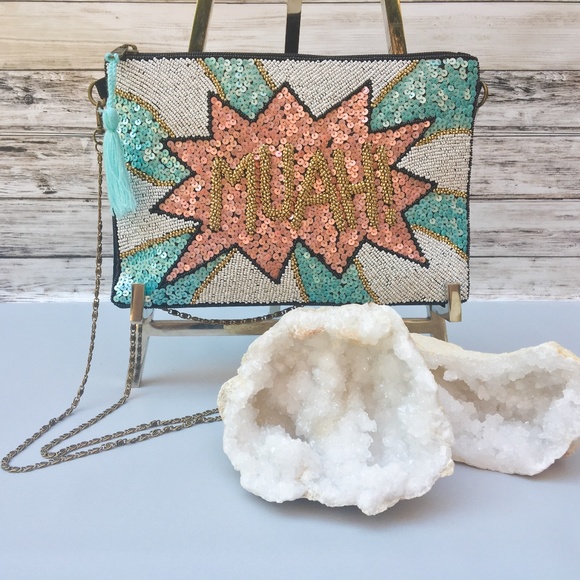 Made of sequence, beads, and velvet like fabric.Front 'Muay" made of curled gold beads suronded by shiny rose pink sequence. Borders of gold and black beads. With wide spokes of light gray beads and light teal sequence. Zipper hardware with multi color tassels. Back made of black velvet like fabric. Inside liner made of black fabric. With zipped inside pocket. Attachable metal strap to convert to crossbody. Hardware antique gold. 11" X 7.5". Made in India.