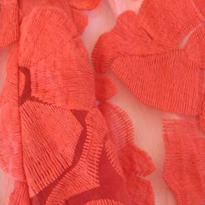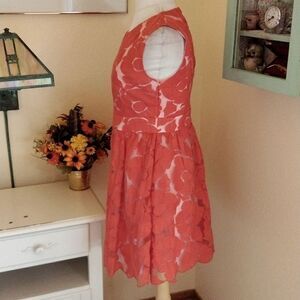 A whisper of the past, when lovly things were valued. This beautiful layered dress has a gorgeous overlay that is sheer blush embroidered in warm CORAL flowers. Sleeveless fit and flare shape. Fully lined, back zip. Size M measures 36 at chest, 28 at waist, lining 42 at hips. 35 long from shoulder to hem. This is a great dress for work, or play.