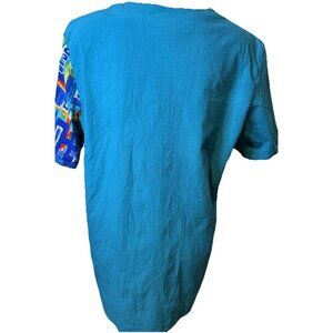 The blouse is a classic fit and is available in size M. It is a colorful blouse made in the United States by CM Shapes.