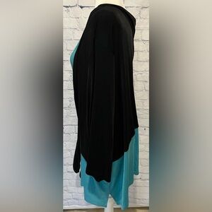 Elevate your wardrobe with this stunning tunic blouse from CM Shapes. With a solid pattern and relaxed fit, this top is perfect for any occasion, whether it's a casual day out, a business meeting, or a party. The long sleeves and round neckline give a classic touch, while the pullover closure adds convenience. Crafted from a blend of acetate and spandex, this top offers both comfort and flexibility. The black and blue color combo is both bold and versatile, while the plus size fit and stretchy material ensure a flattering silhouette for all body types. This is very similar to the Chico's Travelers fabric. Size is 5X, 37" pit to pit and 31" long. Smoke free home.