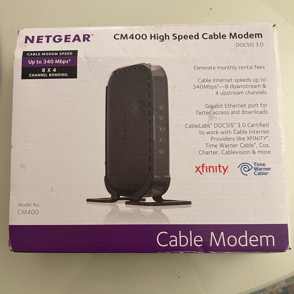 Cable internet spores up to 340 mbps, 8 downstream & 4 upstream channels. Excellent used condition, complete - all cables included ( see photo).