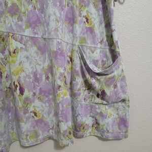 Stylish tunic with a abstract floral pattern. Features a convenient pocket and partially open sleeve. Perfect for casual outings.