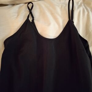 This chic CMC2005 women's black dress features a sleeveless design with delicate spaghetti straps and a flattering v-neckline. Its asymmetrical cut adds a modern twist to the classic slip style, making it perfect for cocktail parties or a night out. The dress drapes beautifully, offering a sophisticated silhouette. Has side zipper. Size medium. pit to pit measures 16 inches. Length 29 inches short side and 39 inches longer side.