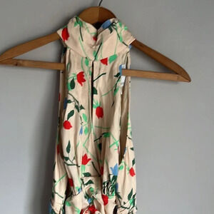 Apricot shirred halter mini dress. Light cream with floral print of green vibes with red and blue flowers. Halter style high neck collar with buttons. Plunge nevk. Zipper back. Sleeveless. Ruched shirred gathered skirt. Waist tie sash that can be tied in front or back.