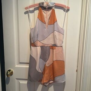 Stylish halter romper with a colorblock design. Features shades of orange, gray, and cream.