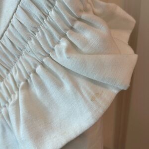 There is a stain on the front ruffle part. Added to pictures of the same stain different angle. Didn’t try to take it out.