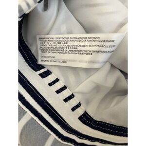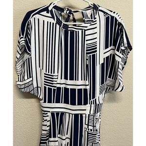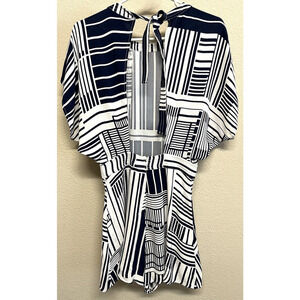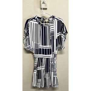 In excellent condition, SIZE XS, IN NAVY BLUE/WHITE GEOMETRIC, PLAYSUIT, LINED, CUT OUT BACK, ZIP CLOSURE