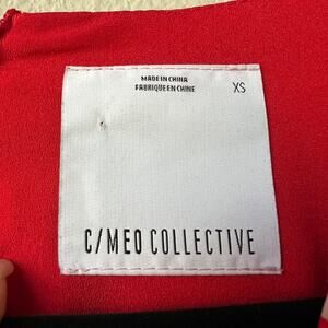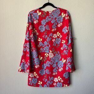C/MEO Collective mini shift dress in vivid red with powder blue and cream floral. Features a flattering V-neckline, concealed back zip, and long sleeves with adjustable split cuffs. Fully lined. Size XS (fits oversized) – 19” pit to pit; 33” length.