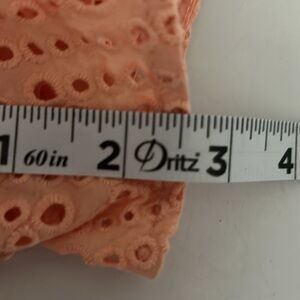Peach off the shoulder eyelet lace romper. Partially lined. Relaxed fit with elasticized waist. 3/4 length flared sleeves. Sash waist. 2.5" inseam on shorts. 100% cotton. Size small. Non smoking home.