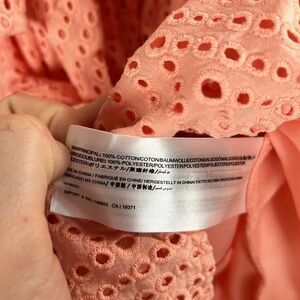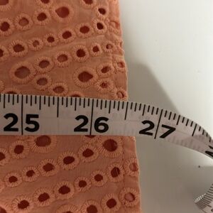 Peach off the shoulder eyelet lace romper. Partially lined. Relaxed fit with elasticized waist. 3/4 length flared sleeves. Sash waist. 2.5" inseam on shorts. 100% cotton. Size small. Non smoking home.