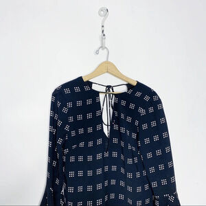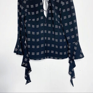 C/MEO COLLECTIVE. Women’s XS. Spelt Out Long Sleeve Top. Black and white graphic print. Cascading sleeves flutter at the sides of a breezy long sleeve top. Ties behind neck. Plunging neck cutout. Long ruffled trumpet sleeves. Lined. 100% polyester. All measurements are approximate and taken flat and un-stretched.