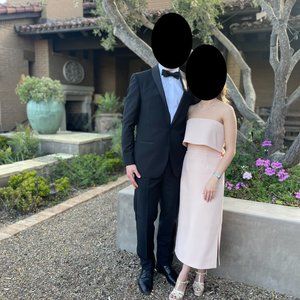 Purchased in 2022 from a boutique; worn once; professionally dry cleaned; notes on condition: light staining on front (pictured), light staining on side near slit (pictured), pin marks in tag from dry cleaning (pictured), light mark on inside front (pictured)