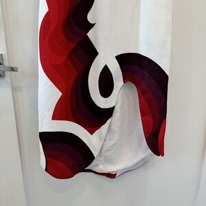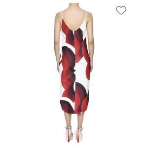 C/MEO Collective red swirl dress with a high low hem, spaghetti straps and a low scoop back