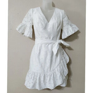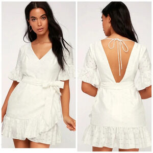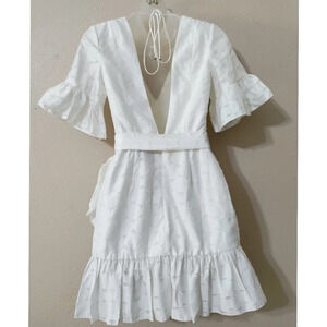 The C/MEO Magnetise White Backless Mini Dress is a conversation starter and a compliment catcher! Airy, woven fabric, with a dotted design throughout, forms this femme and flirty mini dress with a V-neckline and ruffled short sleeves. Princess seamed bodice tops a fitted waist (with removable waist sash) and wrapping, ruffle trimmed skirt. Open back with top tie and hidden zipper.