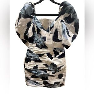 Brand new with tags C/MEO Collective puff sleeve mini dress, originally sold on Revolve. Features dramatic puff sleeves, a flattering ruched silhouette, and a striking abstract floral print in black, white, and blue. Crafted in a lightweight linen-viscose blend that’s breathable and structured. Perfect for weddings, parties, or any event where you want to turn heads.