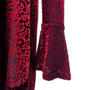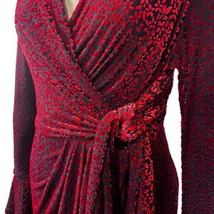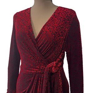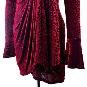 Super flattering velvet dress in like new condition from C/MEO. Wow the crowd in this slinky stretch knit dress with luxe, red velvet floral applique, a plunging surplice bodice, and long sleeves with flounce cuffs. Knotted detail accents the waist above a figure-skimming mini skirt with overlapping tulip hem.
