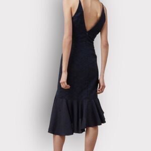 C/MEO Collective Phase Cascading Ruffle Navy Blue Midi Dress