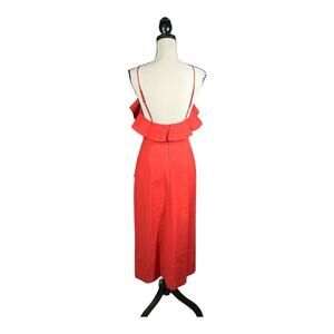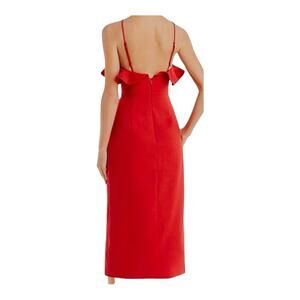 C/Meo Collective Red Ruffle Affinity Envelope Skirt Sheath Dress in a size US 4. Back zipper. Fully lined. Adjustable straps. 70% viscose, 30% polyester. Measures approximately 15” armpit to armpit, 13” flat lay waist, 47” in length not including the straps. In great condition.