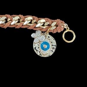 I don’t remember the brand of this bracelet, but it is marked with CN. I purchased it on home shopping at either HSN or QVC. It is a goldtone heavy length bracelet wrapped in brown leather with a gold medallion and evil eye with blue stone and rhinestone accents along with a butterfly charm, the closure is a toggle. This is brand new and was never worn, but I do not have the original box or tags.