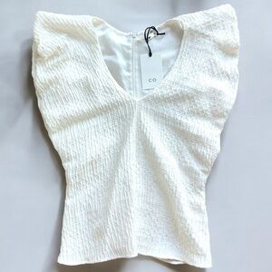 CO Avery Linen Crepe Pleated Cap Sleeve Textured Jacquard V Neck Blouse Top NEW Size XS