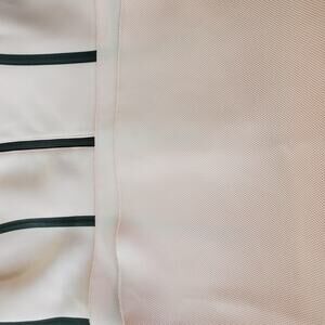 Light pink pique fabric with black mesh at front shoulders with grey narrow lines accenting dress. Back zipper. Fabric 95% polyester, 5% spandex.