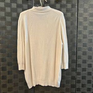 Ivory, silk, ribbed, size xl, small hole back of sweater. Measures 26 1/2" back length, side seam (armpit to bottom) 17 1/2", waist measurement 41 1/2, bust (armpit to armpit) 40", sleeve length (armpit to end of sleeve) 10", measure 35" around ribbed finished edge.