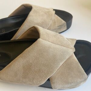 Minimal style cross over platform slide in Tan. Pre-owned. Minor wear and marks on the suede - please see photos
