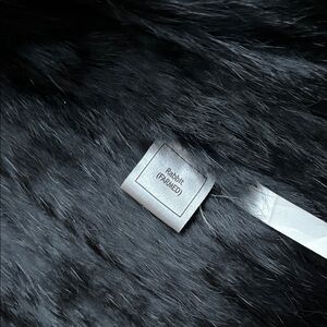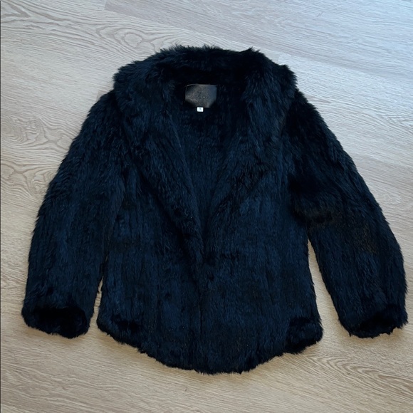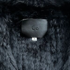 100% real farmed rabbit fur jacket by Co. Size small. Quarter or 3/4th sleeves. Hooked front closure. Slight cropped fit, hits at the hips. Excellent condition! Only thing worth noting is the loose string at the label.