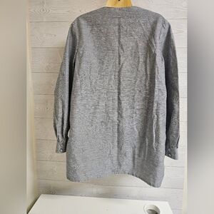 This gray tunic features a relaxed, boxy silhouette with a mandarin collar and long sleeves, offering a comfortable yet stylish look. The buttoned front adds a touch of sophistication, making it a versatile choice for both casual and dressier