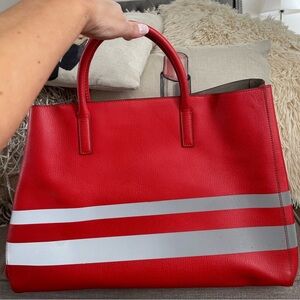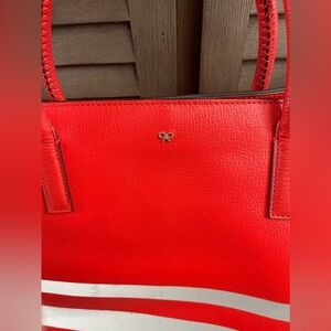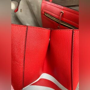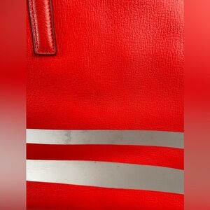 Ebury light weight large tote in red reflective. Rolled top handles with side snaps and tie closure. Safety metal feet. Very good condition w/some marks aNd small stain in interior/exterior(see pix)Very clean corners with No rips/holes or tears to mention. Bag comes W/it’s most adorable Original Dust bag⭐️♥️