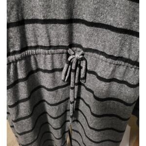 Super cute knit cardigan/jacket. Gray with black stripes. Ruffled, open front. Hood in back. Cute tie in back. Slit in back for added comfort. POCKETS!!!