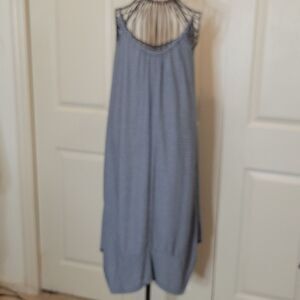 Measures 18" across the chest with lots of stress, 48" from shoulder to longest part of hem and 42" from shoulder to shorter part of hem.