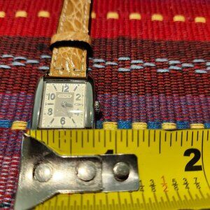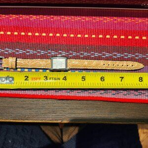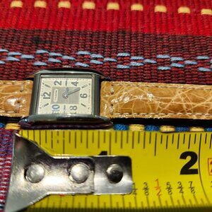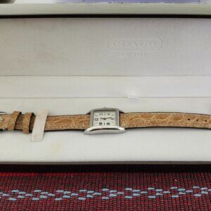 COACH 0241 Swiss Quartz Women's Stainless Tank Watch~Original crocodile band (0494). There is very little wear on this timepiece, and one small imperfection is present on the band, located at the crease where the band meets the watch face (please see the photo). Other than what was mentioned, there are no scratches, nicks, chips, stains, or other imperfections. Please see pictures for measurements. This watch comes in its original box, owner's operating instructions/guide, and purchase certificate from 2006.