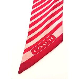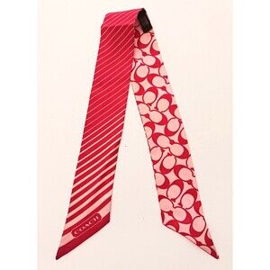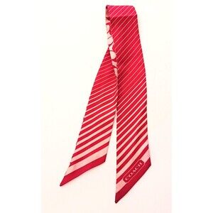 The COACH 100% Silk Skinny Scarf in red and pink with a reversible print stripes and a C logo print. This is a stylish and versatile accessory for women. Made from luxurious silk, this rectangle scarf can be worn in various ways - as a ponytail tie or a bag handle wrap, or a traditional scarf around the neck. The striped pattern and Coach logo add a touch of designer flair to any outfit, making it a must-have for fashion-forward individuals looking to elevate their look. 2.5 X34 with tapered point ends. Beautiful!