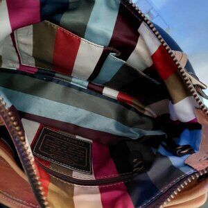 COACH Vintage Legacy 65th Anniversary Vachetta Tan Leather Shoulder Bag. The 11127 Vintage is a stylist limited edition handbag. The leather is high quality, and this is a medium bag. This bag is more of a light butterscotch color. It is in good condition, but there are some things to point out. There are very light scratches/wear on some of the leather (see pics), and there is a semi circular stain on the bottom, which did not come out with cleaning. However, is not well seen unless you flip it over, I think it is a water stain). Also, the nice wide strap is a darker shade, that easily stays on your shoulder. The leather is in good shape. The hardware is working and is a brass color. There is a pocket highlighted in the front with a turn lock closure. The top is secured by a zipper. There is a good sized exterior back pocket. Inside there is a zip pocket, and two slip pockets, with colorful rainbow lining and the Coach Creed identifying the vintage. It is a beautiful well maintained vintage bag with many years of use left.