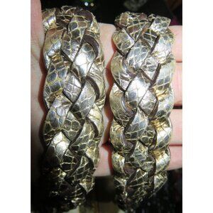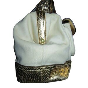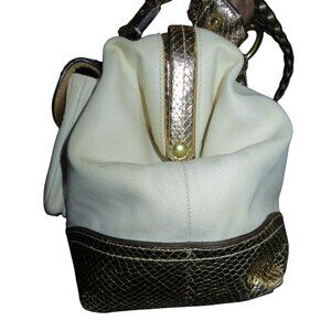 Cream canvas and gorgeous brown python embossed leather trim/ Beautiful braided handles/ brass hardware/ interior rich brown fabric lining/Interior zipper compartment & 2 open pockets/exterior dual turn lock pockets/hinged frame top closure with dog leash clip & clasp/inner keyring