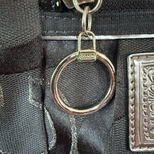 The COACH 2010 POPPY OPT ART SATEEN LUREX SATCHEL BAG in black and silver is a stylish and versatile accessory for women. This rectangular satchel/top handle bag features a black exterior with silver accents, accented with a logo pattern and nickel hardware. It is perfect for various occasions including travel, weddings, parties, casual outings, and business meetings. The bag includes a removable shoulder strap, double handles, and inner pockets for organization. Made of canvas, it is lightweight and features a mobile phone pocket and other convenient details. This Coach Poppy model combines functionality with a touch of artistry, making it a chic and practical choice for any woman on the go.