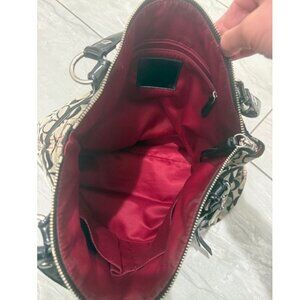 Coach poppy embossed Signature C purse - logo all over the outside. It is Burgundy/maroon inside with a large zipper inside and red letter "C" accents all over. The exterior fabric and the interior of the purse are in great condition- however the straps had lots of wear on them so I had a cobbler fix them with reinforced stitching.