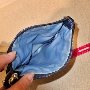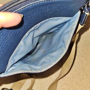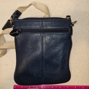 COACH 42206 Penelope Navy Pebbled Leather Crossbody with a zippered closure and silver hardware. The interior and pockets are sateen lined and has an adjustable strap with a drop of 23 inches. 1 exterior front slip pocket and 1 exterior rear zip closure pocket.