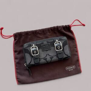 COACH 43393 Zoe Black Signature Double Buckle Wallet Jacquard Leather Zip Clutch