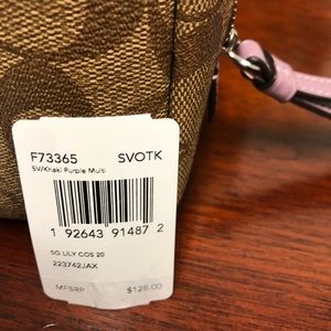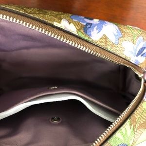 Signature coated canvas with smooth leather details| Inside snap pocket| Zip closure, fabric lining| Wrist strap attached| 7 3/4" (L) x 4 3/4" (H) x 2 3/4" (W)