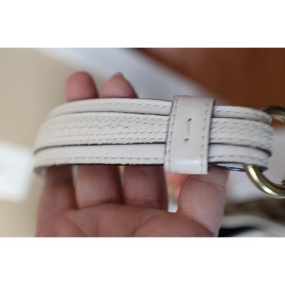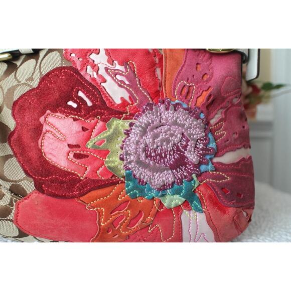 Lovely signature canvas cc with braided Ivory leather detail shoulder strap . Brass hardware, snap top closure. Inside has 2 slip and 1 zippered wall pocket. The floral applique has a 3D effect, it is Stunning The poppy is made of red and burgundy suede and leather, purple blue and green background with white stitching, it has And of course the matching poppy applique on signature jacquard fabric