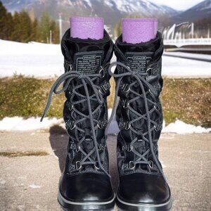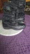 Black and gray boots, slip in, tie closure. Silver hardware.