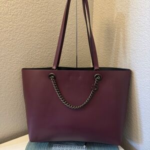 This is a COACH 78218 Signature Chain Central Tote in Boysenberry smooth calf leather with gunmetal hardware